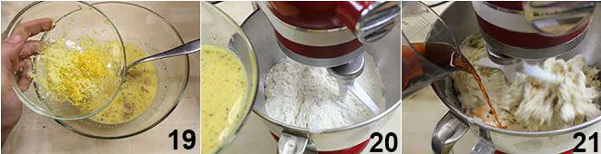 the grated lemon zest and ginger 19. Pour the yeast and flour mixture into the bowl of a stand mixer (or a large bowl if kneading by hand) and start the machine fitted with the paddle attachment (low speed). Pour the egg and milk mixture into the bowl 20, then another 50 ml of rum 21, and the sugar.