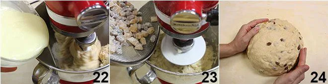 Finally, add the melted butter a little at a time 22. As soon as the ingredients are incorporated, remove the paddle and attach the dough hook, then knead for about 10 minutes until the dough is homogeneous and completely attached to the hook. Add the chopped (cold) almonds, then the floured raisins and candied orange 23, and knead for a couple of minutes. Place the dough on a work surface, shape it into a round form 34.