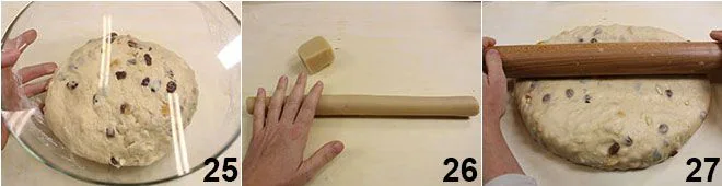 Then place it in a large bowl, cover with plastic wrap, and let it rise for an hour in a warm place 25. Meanwhile, take the marzipan and shape it into a cylinder 26. After the rising time, place the dough on a work surface, shape it into a rectangle, and press in the center with a rolling pin, slightly lengthening the dough to create a thicker bulge on the longer sides 27.