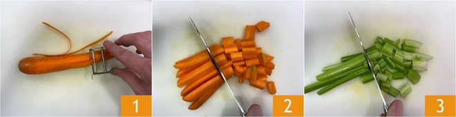 To prepare the stracciatella in vegetable broth, first, prepare the broth. Wash the vegetables thoroughly and peel the carrots 1. Then cut them into chunks 2 and do the same with the celery 3.