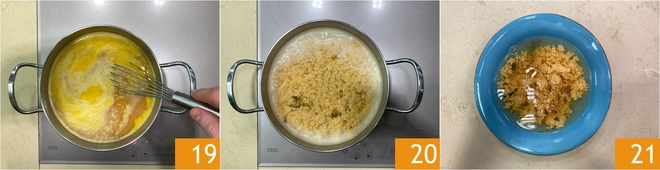 Pour it back into the pot 13 and keep it warm. Meanwhile, in a bowl, pour the eggs 14 and add the Parmesan cheese 15.