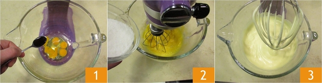 To prepare the strawberry roll, start with the sponge cake: pour the eggs and vanilla extract into the bowl of a mixer with whisks 1. Turn on the machine and slowly add the sugar. Work for about 10 minutes until you get a fluffy, light, and frothy mixture 3.