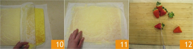Let it cool slightly before very gently removing the parchment paper sheet 10. Then cover it again with the parchment paper sheet and let it cool completely 11. Now wash the strawberries and remove the stem 12.