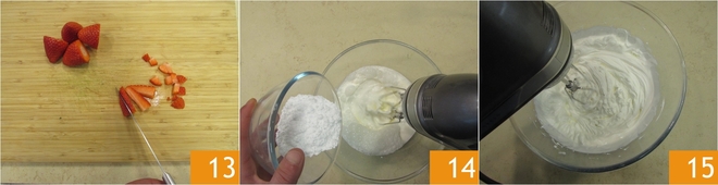 Cut them first into slices and then into cubes 13. Pour the cold fresh cream into a bowl; start whipping with electric whisks and slowly add the powdered sugar 14. Continue until you get firm, but not overly whipped, cream 15.