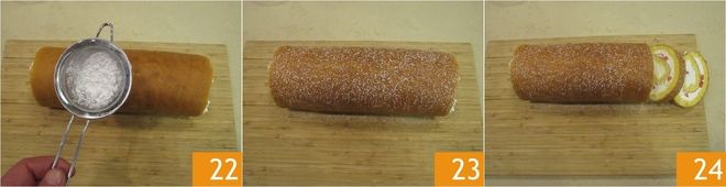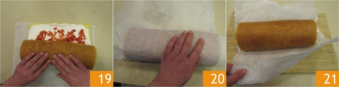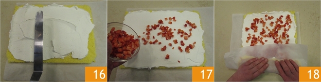 Once the sponge cake is completely cool, remove the parchment paper and fill it with the whipped cream. Use a spatula to spread it well over the entire surface 16. Sprinkle the strawberries on top 17 and, lifting the parchment paper, roll the cake from the shorter side 18.
