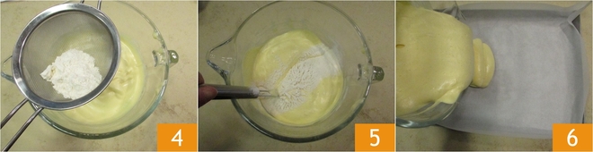Add the flour by sifting it directly into the bowl 4 and gently mix with a spatula from bottom to top to incorporate it 5. Butter and line a 12x16 inch baking tray with parchment paper. Then pour the batter into the tray 6.