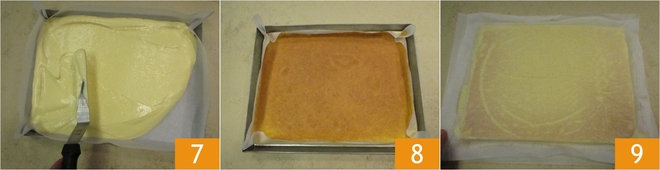 Level the surface with a spatula 7 and bake in a preheated static oven at 425°F for 8-10 minutes until the surface is golden and the batter is cooked 8. Clearly, adjust according to your oven, it could take fewer minutes or a lower temperature if very powerful. In the meantime, prepare a sheet of parchment paper and place it on the counter. As soon as you take the sponge cake out of the oven, you will need to flip it onto the parchment paper sheet 9, in this way it will remain moist.