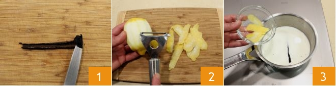 To prepare the strawberry Bavarian cream, start with the crème anglaise, which is the base of the dessert: split half a vanilla bean and scrape with the tip of a knife to extract the seeds 1. Peel the lemon zest, being careful not to remove the white part 2, and add the two aromas to the saucepan with the milk 3: heat over low heat until it almost boils, then turn off the heat.