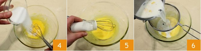Meanwhile, place the egg yolks in a large bowl, whisk them, then add 65 g (1/3 cup) of granulated sugar gradually while continuing to mix 4 and add a pinch of salt 5. Work them for a few minutes until you get a homogeneous mixture. Pour the warmed milk over the beaten eggs, filtering it with a fine-mesh strainer 6.