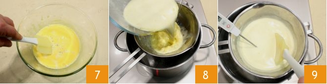 Mix with a spatula 7 and place the cream to cook in a bain-marie over low heat, always stirring 8; the temperature of the cream should never exceed 185°F (85°C) (check with a kitchen thermometer) 9.
