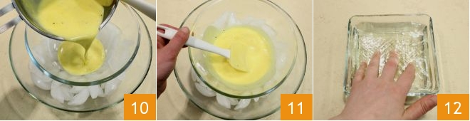 When the cream is ready, pour it into a bowl and place the bowl in a larger one filled with ice 10: this way, you will immediately cool the cream without affecting its consistency. Stir 11 then remove it from the ice and cover the cream with cling film, making contact to allow it to cool completely. Soak the gelatin sheets in very cold water 12 for at least 10 minutes.