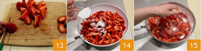 Wash, drain well, and remove the stem from the strawberries, then cut them into pieces 13 and cook them in a pan with 40 g (about 3 tbsps) of granulated sugar over low heat, covered with a lid (14-15).