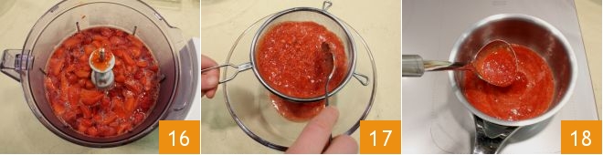 Blend the cooked strawberries with the sugar 16 and strain the obtained puree 17. Then transfer it to a saucepan and put it back on low heat 18.