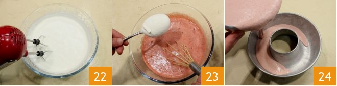 Then separately whip 500 ml (about 2 cups) of fresh cream (not too firm) 22 and add it to the strawberry cream 23 and mix well: it should be fluid, creamy, and homogeneous. Then take a bundt pan and wet the inside with cold water. Gently pour the obtained mixture into a 9-inch (22 cm) diameter mold with a 1.5 qt (1.5 lt) capacity 34.