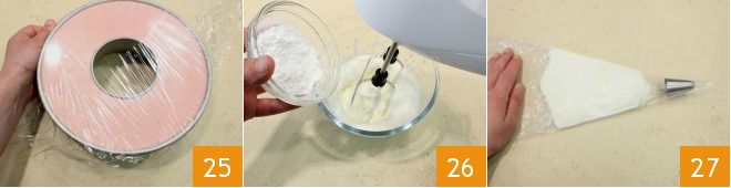 Cover it with cling film 25 and place it in the refrigerator for at least 4-6 hours (it would be better to prepare it the night before). Then prepare the whipped cream with powdered sugar 26 and place it in a piping bag 27 and in the refrigerator until ready to use.