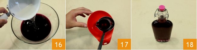 finally, add the now cold syrup and mix the liqueur well 16. Use a funnel to pour the liqueur you have obtained 17 into sterilized bottles with airtight caps 18. Let the strawberry grape liqueur rest for at least 10 days in a cool, dark place before consuming.