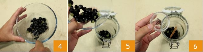 In a bowl, lightly crush the grapes with a fork 4, then place them in a large airtight glass jar 5. Add the cinnamon and cloves 6;