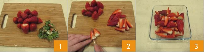 To prepare the strawberry milkshake, start by cleaning the fruit. Thoroughly wash the strawberries and remove the green parts 1, then cut them into quarters 2 and set them aside 3.