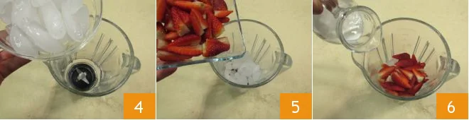 At this point, pour the ice into a blender 4, add the previously cut strawberries 5 and also the milk 6.