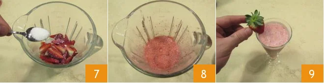 Finally, add the sugar 7 and blend until you have a creamy and homogeneous mixture 8. Pour everything into glasses and decorate with a small strawberry, slicing it from the bottom 9. Serve the strawberry milkshake well chilled!