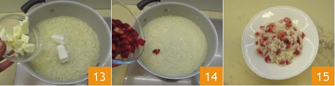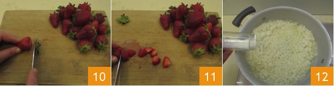 While the rice is cooking, wash the strawberries, remove the stems with the leaves 10, and cut them into pieces 11. Once the risotto is ready, add salt 12 and turn off the heat.