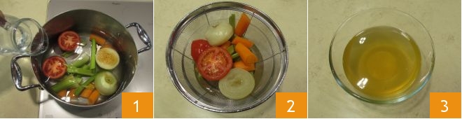 To prepare strawberry risotto at home, start with the preparation of the Vegetable broth. Boil the vegetables (carrots, celery, tomatoes, and onions) in plenty of salted water for about an hour 1, then strain the broth through a sieve 2 and set it aside 3.