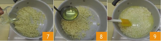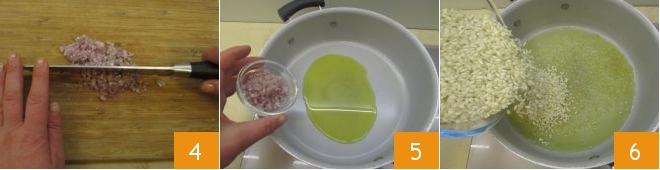 Then prepare the risotto: peel and finely chop the shallot 4, heat the olive oil in a saucepan over low heat, then add the chopped shallot 5 and let it soften for 5-6 minutes, stirring occasionally; add the rice 6 and toast it for another 2-3 minutes, stirring often.