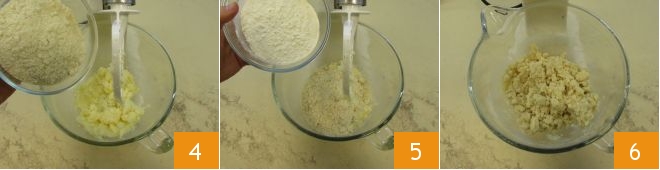 Then add the almond flour 4 and all-purpose flour 5 all at once. Once all ingredients are well mixed, turn off the machine 6.