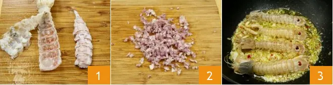 To prepare the strozzapreti with mantis shrimp sauce, start by thoroughly rinsing the mantis shrimp, then keep the 4 largest and extract the meat from the others. To facilitate the operation, it is advisable to immerse the mantis shrimp for a few seconds in boiling water; this way, it will be easier to extract the meat 1. Then chop the shallot 2 and sauté it in a pan with the oil over low heat along with a few pieces of chili pepper.