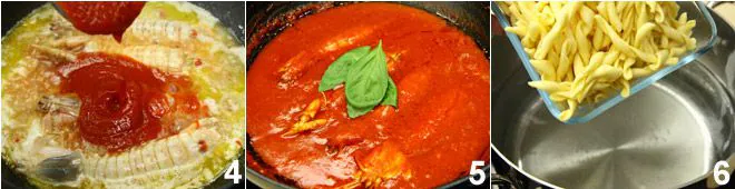 Gently stir and let the sauce thicken, being careful not to break the whole mantis shrimp. Finally, salt and add a few basil leaves 5. Cook the strozzapreti in plenty of salted water 6, drain them, and toss them in the mantis shrimp sauce for a few moments.
