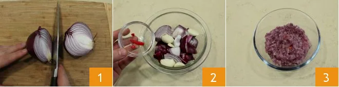 To prepare the spicy chicken and peanut stew, peel the red onion and cut it into pieces 1; place it in a small bowl with the garlic and chili pepper 2. Chop everything with a mixer or an immersion blender 3 and set aside.