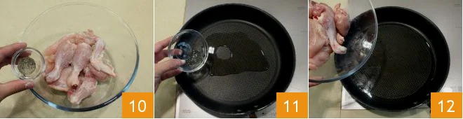 and the pepper 10; then massage the meat with your hands so that it is well seasoned. Heat the peanut oil in a large non-stick pan 11 and add the chicken pieces 12 to brown.
