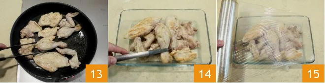 Turn it over on both sides 13 and cook for about 4-5 minutes on each side; then remove the chicken and set it aside in a warm place 14, covered with plastic wrap 15.
