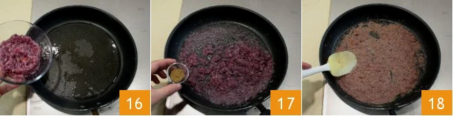 In the same pan where you browned the chicken, pour in the chopped onion and garlic 16, add the ground cumin 17 and stir 18, letting the mixture soften for a few moments.