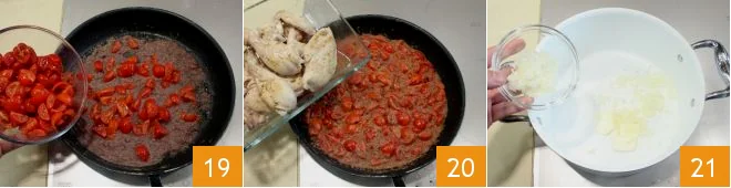 Then add the tomatoes 19 and continue cooking for about 10 minutes until the tomatoes release their liquid and soften slightly. Now also add the chicken pieces 20, let them absorb the flavor, then cover with hot water or chicken broth and cover with a lid: cook for at least 40 minutes on a very low heat and check from time to time to ensure the liquid does not dry out too much. Meanwhile, prepare the pilaf rice: finely chop the onion and in a large saucepan, melt the butter, add the chopped onion to the melted butter 21 and let it soften over low heat for about 15 minutes, until it becomes transparent: be careful not to let it color.