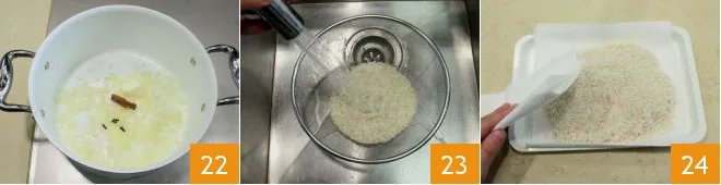 Add the cinnamon and cloves 22 and stir for another two minutes. Meanwhile, rinse the rice under running water, drain it thoroughly and allow it to dry completely on a tray lined with absorbent paper 34.