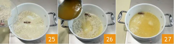 Add the rice to the pan 25 and toast it for a few moments, stirring with a wooden spatula. Then add all the broth (26-27). Cover the pan with a lid (there should be no vents) and let it cook for at least 18-20 minutes on moderate heat until the broth has completely dried. Once cooked and well dried, remove the pilaf rice from the heat, fluff it well with a fork and set aside.