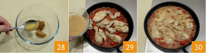 In a small bowl, dilute the peanut butter with 2-3 tablespoons of the chicken cooking liquid 28 and add it to the pan 10 minutes before finishing cooking the chicken 29. Once cooking is complete 30, serve the hot spicy chicken and peanut stew accompanied by pilaf rice!