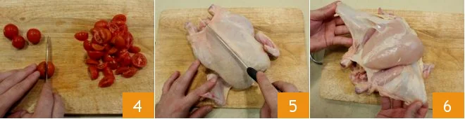 Also wash the tomatoes and cut them into quarters 4, then move on to the chicken: clean it by removing the outer skin by scoring it with a very sharp knife 5; once all the skin is removed 6, also remove any fat parts that may be present