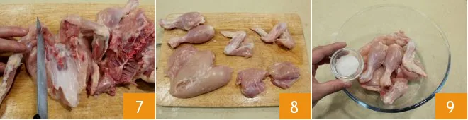 then cut the chicken into pieces (7-8), carefully removing any small bones. Place the chicken in a bowl, add the salt 9