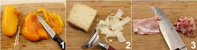 To make the stuffed bread, start by roasting the yellow pepper in the oven; when it's cooked, peel it and cut it into strips 1 (alternatively, you can use pre-roasted peppers). Slice the fontina cheese thinly 2 and cut the Prague cooked ham into strips 3.