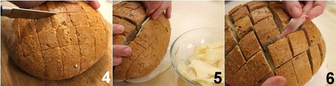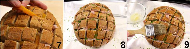 With a serrated knife, cut the loaf into slices about 1.38 inches wide, but do not cut through the base of the bread; proceed by cutting the slices perpendicularly as well (again, without cutting through the bottom), thus obtaining a checkered surface 4. Start stuffing the bread: insert the fontina 5, and Prague ham 6 into the cuts made,