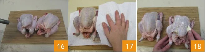 Meanwhile, flame the cockerels, this way you can remove any feathers that are still attached, to do this you can use a blowtorch or, if you don't have one, you can pass the chickens directly over the stove flame 16. Wash and dry the cockerels well 17 and grease them, both inside and out, with soft butter 18.