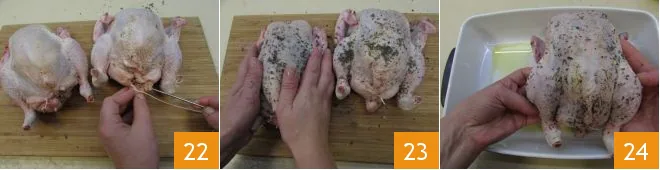 Salt and pepper the surface and inside of the chickens 19, add a little of the aromatic chop 20 and stuff them with the previously prepared filling 21.