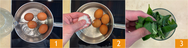 To prepare the stuffed eggs with pesto, first place the eggs in a pot, cover them with cold water 1, and add the salt 2. Bring to a boil and from that point, cook for 8 minutes. In the meantime, focus on the pesto: place the basil in a container 3.