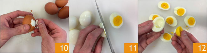 Peel them 10 and cut them in half 11, then gently remove the yolks 12 and place them in a bowl.