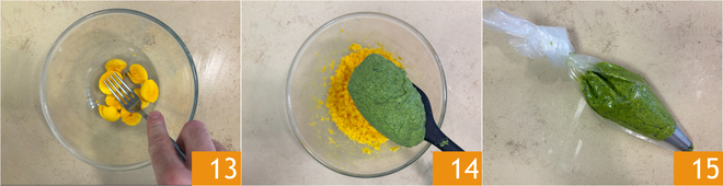 Smash the yolks with a fork 13, then add the pesto 14 and mix well to combine evenly. Transfer everything into a piping bag fitted with a star nozzle 15.