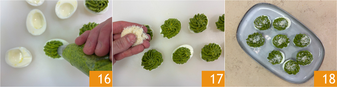 Fill the egg whites with the pesto mixture 16 and finish with a sprinkle of grated Parmesan cheese 17. Your stuffed eggs with pesto are ready to be served 18!