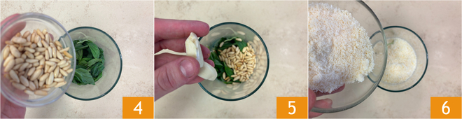 Add the pine nuts 4, garlic 5, the grated Parmesan and pecorino cheese 6.