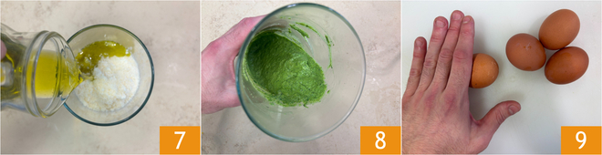 Finally, add the olive oil 7 and blend with an immersion blender until you obtain a smooth and homogeneous mixture 8; set aside. Once cooked, put the boiled eggs in cold water, then roll them on the workbench applying slight pressure to crack the shell in multiple points 9.